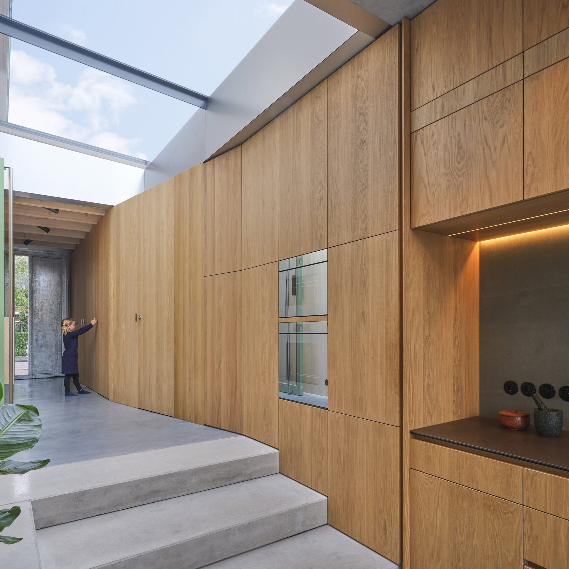 In het East West huis komen verschillende werelden samen in een rijk palet aan materialen en texturen. Onder het grote dakraam in de uitbouw van de woning heeft zich het nieuwe hart van de woning gevormd. Het ontbreken van een duidelijke functie voor deze ruimte verrijkt het ontwerp.