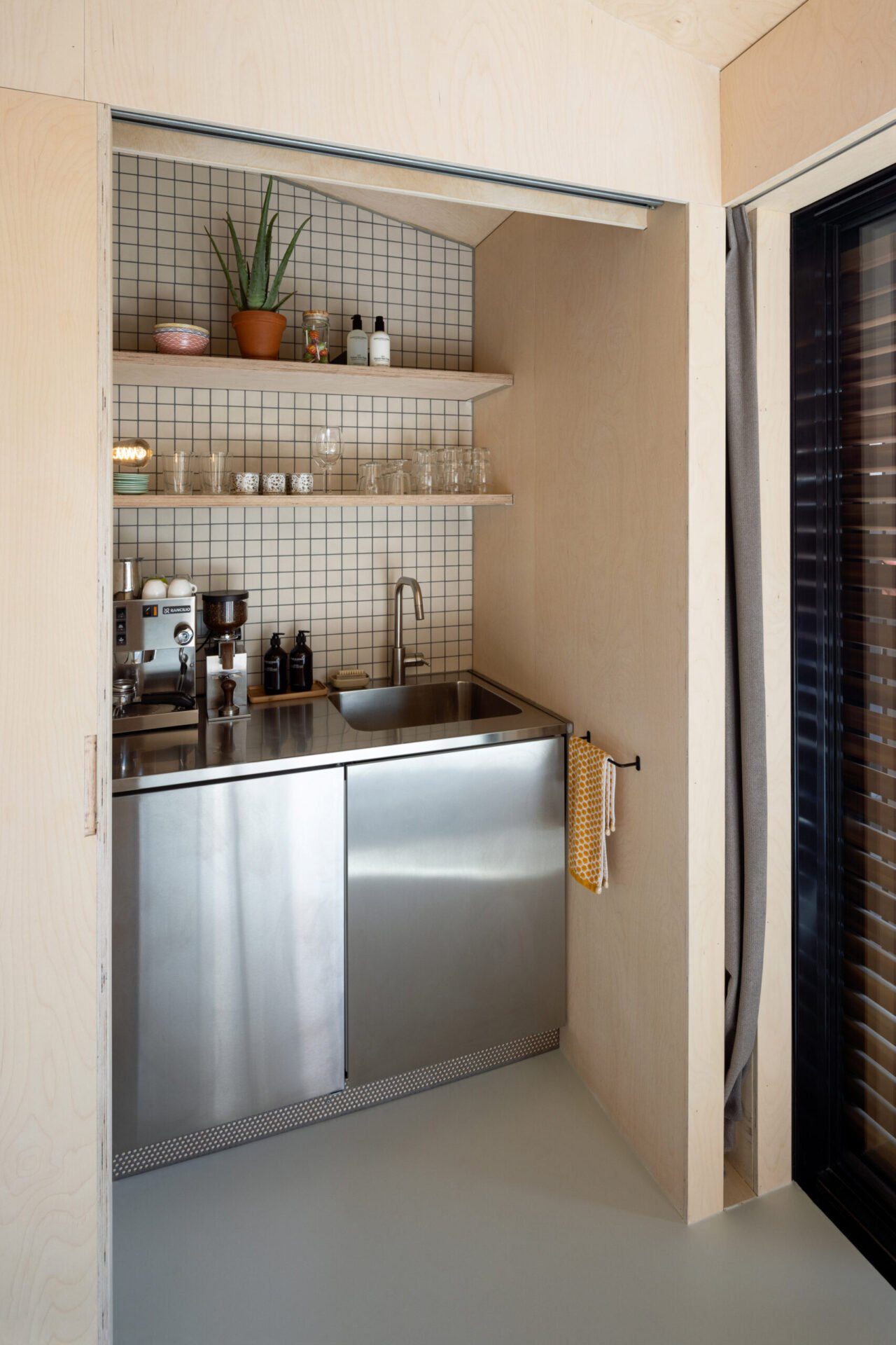 De invulling van het minimale stalen skelet van de dakopbouw is geheel voorzien van houtskeletbouw met vlasisolatie. Alle binnenwanden en plafonds zijn opgetrokken uit berken multiplex. In de wanden zijn berken multiplex deuren kozijnloos weggedetailleerd of schuiven deze langs het toilet en de pantry. De gietvloer is met zijn lichtgrijze egale kleur een frisse en strakke tegenhanger van het warme houten interieur.