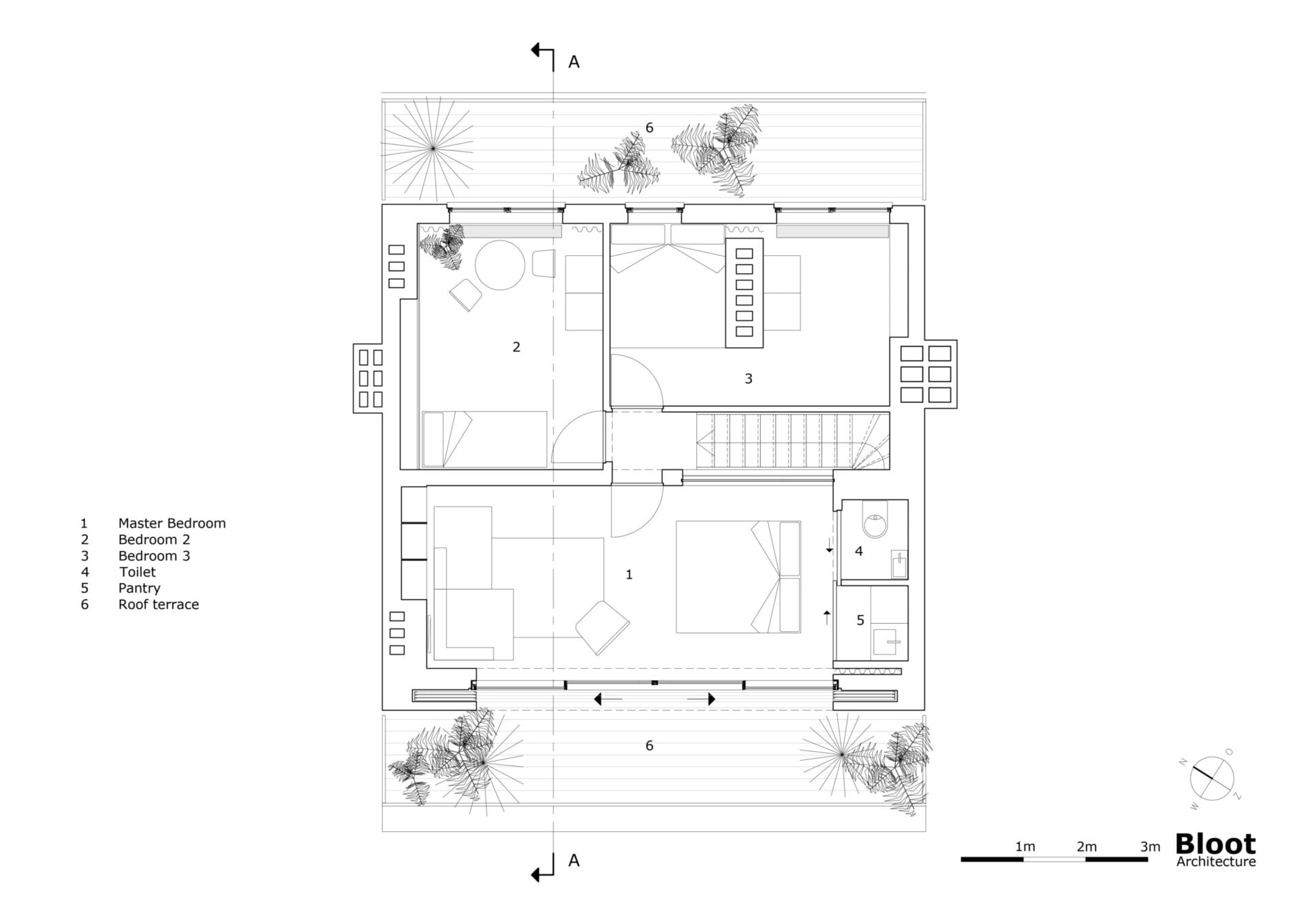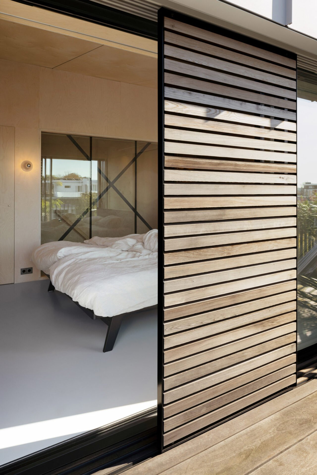 De dakopbouw biedt ruimte aan 3 slaapkamers. De twee kleinere slaapkamers zijn voor de kinderen en de grote slaapkamer is voor het hele gezin. Deze kamer heeft naast een slaapgedeelte voor de ouders ook een zithoek, een toilet en een pantry. De pantry zorgt ervoor dat de buitenruimte als volwaardig gebruikt kan worden. De gehele lange zijde van de hoofdslaapkamer bestaat uit een glazen schuifpui. Doordat de opbouw bovenop de bestaande bouw ligt, is er ruimte om de kozijnen flush weg te werken. Hierdoor lopen binnen en buiten naadloos in elkaar over. Het stalen hekwerk dat in verticale zin doorloopt achter de houten vlonders langs, versterkt dit gevoel van oneindigheid.