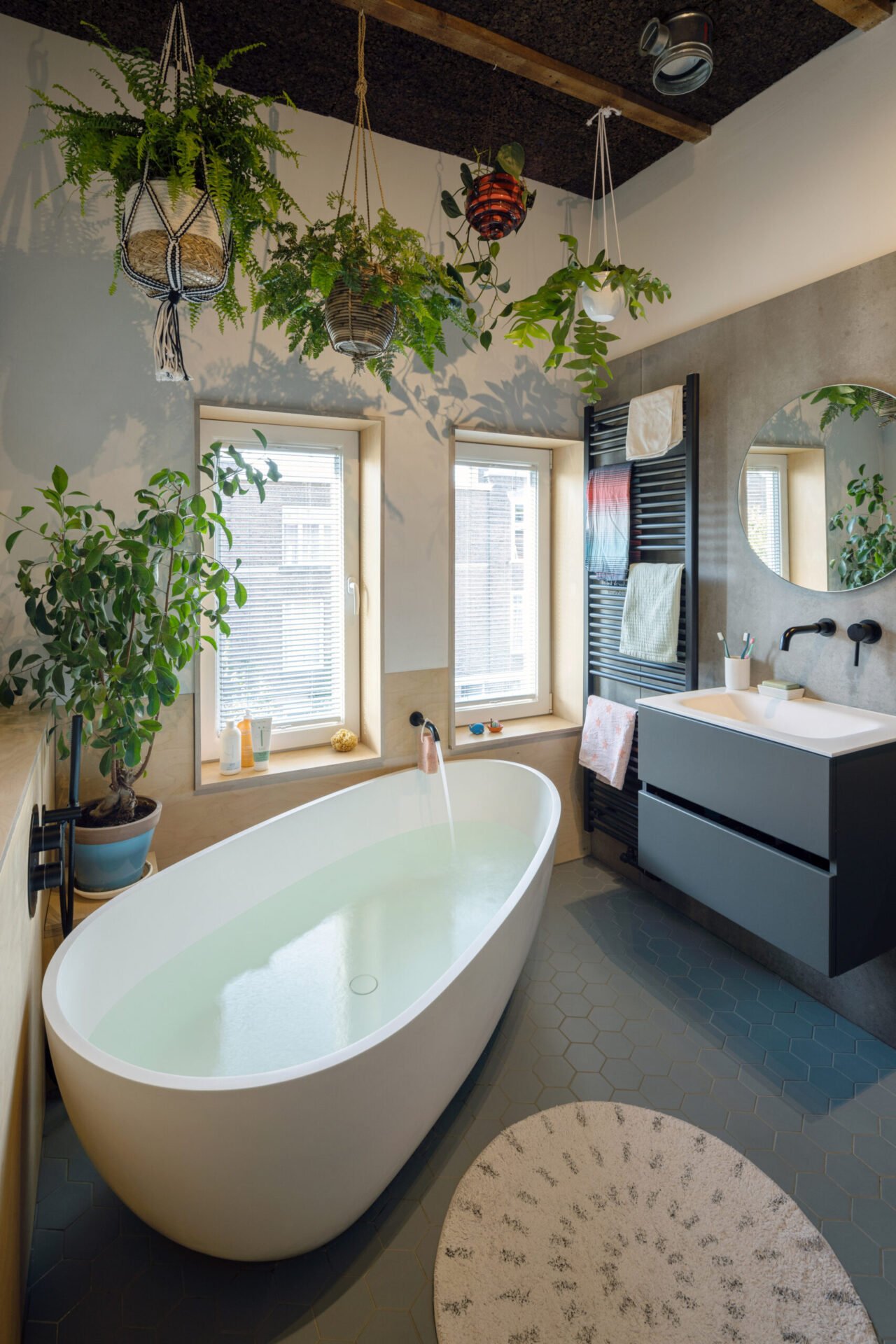 De ruimte die vrij kwam op de bestaande woonetage is meegenomen met deze verbouwing en is veranderd in een badkamer. De berken multiplex wanden lopen via de trap door naar de badkamer en gaan daar over in een lambrisering waarin de kranen van het bad zijn opgenomen.